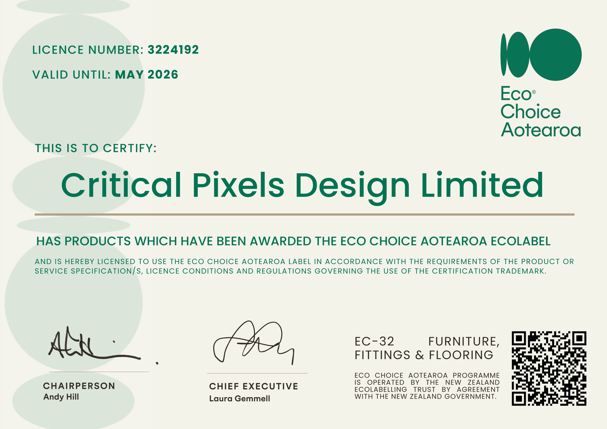 "Eco Choice Aotearoa is thrilled to award its ecolabel to Critical; a business committed to innovation, transparency, people and planet.